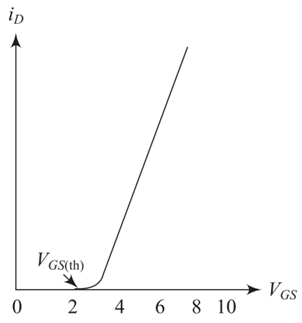 The transfer characteristic of an n-channel power MOSFET is depicted in Figure 10. The drain current ID is a function of gate-to-source voltage VGS. When the gate-to-source voltage is less than threshold voltage VGS(th), the current flow from drain to source is zero. The value of VGS(th) for power MOSFET is about few volts (2 to 3 V). Since ID is equal to zero, the drain to source is open circuit and the device should able to hold the supply voltage VDD.