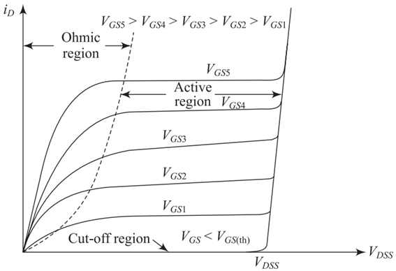The output characteristics of a power MOSFET is shown in Fig. 3.23. The drain current ID is a function of drain-to-source voltage VDS when gate-to-source voltage VGS is constant. It is clear form Figure 11 that the output characteristics consist of three regions such as cut-off, active and ohmic regions.