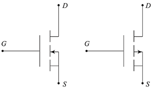 The circuit symbol of n channel power MOSFET and p-channel power MOSFET are depicted in Figure 8. The direction of the arrow represents the direction of current flow.
