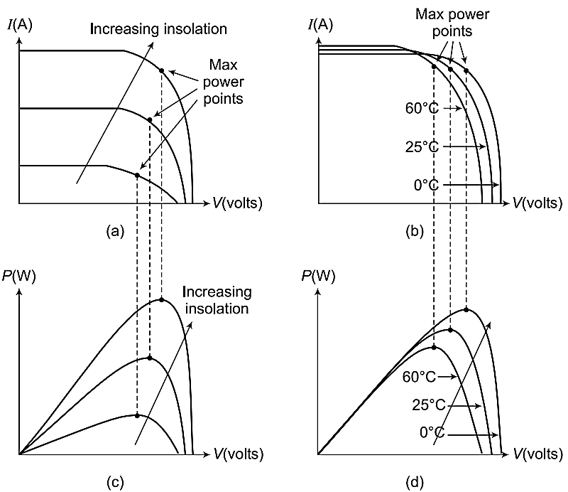 As the insolation keeps on varying throughout the day it is important to observe its effects on PV characteristics. If the spectral content of the radiation remains unaltered, and temperature and all other factors remain same, both I_sc_ and V_oc_ increase with increasing the intensity of radiation. The photo-generated current depends directly on insolation. Therefore, the short circuit current, depends linearly while open circuit voltage, depends logarithmically on the insolation. This is shown in Fig. 1.7(a,c).