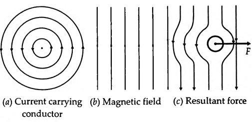 Consider a current carrying conductor of Fig. (a), it produces a magnetic field in the anticlockwise direction. We now have a uniform magnetic field as shown in Fig. (b). Let the current carrying conductor be placed in this magnetic field. The resultant field is as shown in Fig. (c). This results in distortion of magnetic field causing a force F to act from left to right. The reversal of direction of the current will cause a force F in the opposite direction i.e., from right to left subject to the condition that the direction of the existing field remains the same. If we form the conductor into a coil, the magnetic field produced by each turn of the coil will add up and the coil will behave as an imaginary magnet. Consider a current carrying coil. It produces an imaginary bar magnet. When a piece of soft iron which has not been previously magnetized is brought near the end of the coil, it will be attracted by the coil. Therefore, if we pivot the soft iron on a spindle between two bearings and a coil is mounted near it, the iron piece will swing into the coil when the latter is carrying current. The effect is utilized in the “attraction type of moving iron instruments.”