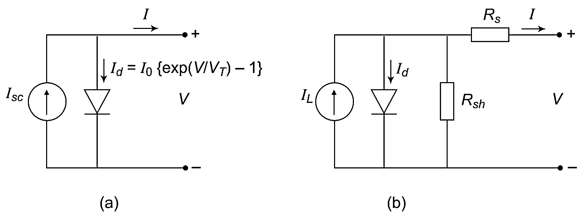 The I-V characteristic given in Eq. (5) is derived for ideal condition, considering the internal series resistance of the cell as zero and shunt resistance as infinite. In actual practice, however, both have finite values, which would alter the I-V characteristics. The ideal and practical equivalent circuits of the solar cell are shown in Fig. 1.5. In practical cells Isc is no longer equal to light generated current IL but is less by shunt current through Rsh. Further, an internal voltage drop of IRS is also included in the terminal voltage.